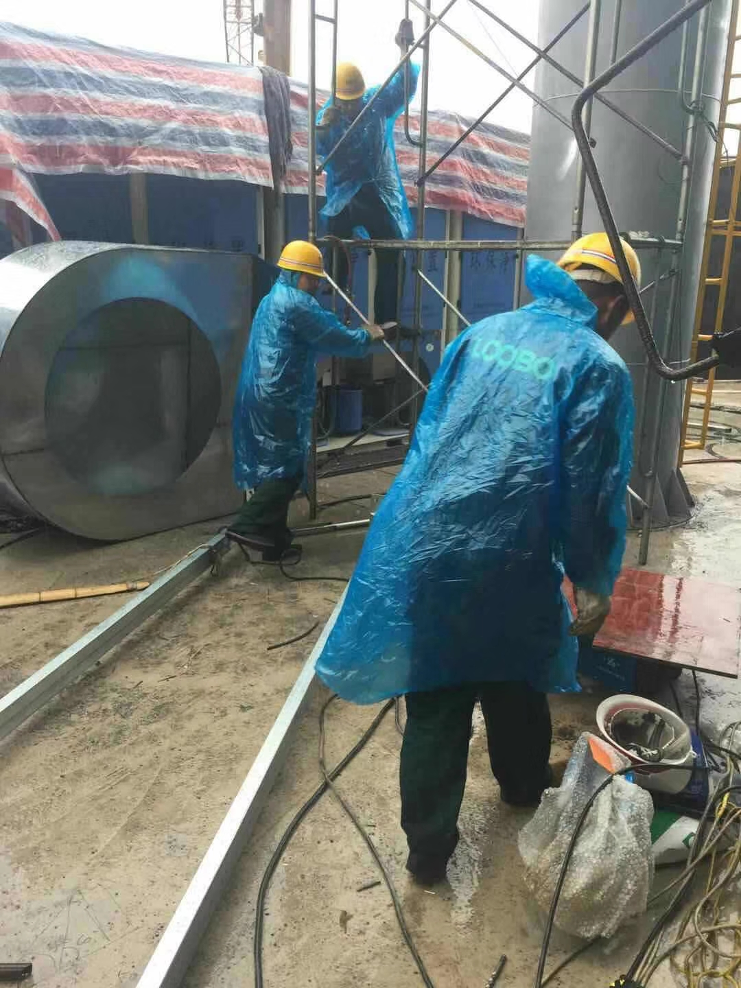落砂房除塵項(xiàng)目施工前期,路博環(huán)保施工人員爭分奪秒,冒雨作業(yè)