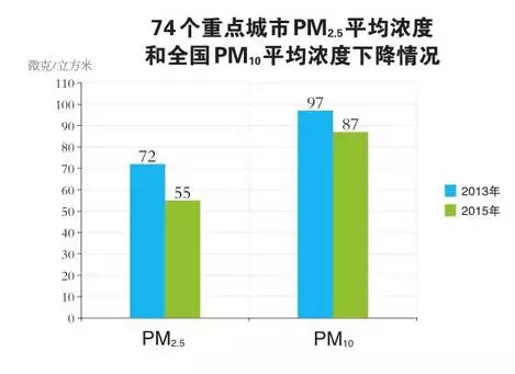 2015年,全國74個(gè)重點(diǎn)城市PM2.5平均濃度為55微克/立方米,相對(duì)于2013年的72微克/立方米下降23.6%;日均值超標(biāo)天數(shù)的比例由2013年的33.2%降至2015年的20.8%。全國PM10平均濃度(338個(gè)城市平均濃度為87微克/立方米),相對(duì)2013年(330個(gè)城市平均濃度97微克/立方米)下降10.3%;日均值超標(biāo)天數(shù)的比例由2013年的14.5%降至2015年的12.1%。74個(gè)重點(diǎn)城市共發(fā)生846天次重度污染和238天次嚴(yán)重污染,較2014和2013年降幅分別為28.1%、24.9%以及49.9%、63.7%。京津冀、長三角、珠三角和成渝地區(qū)NO2濃度相對(duì)2013年分別下降9.8%、11.9%、19.5%和15.8%,SO2分別下降44.9%、30.0%、38.1%和48.3%。衛(wèi)星資料反演顯示,2013~2015年,全國NO2和SO2垂直柱濃度年均值和顆粒物光學(xué)厚度(AOD)總體呈下降趨勢,與地面監(jiān)測數(shù)據(jù)分析結(jié)果一致。