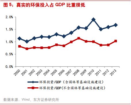 1.高估了的環(huán)保投資,行業(yè)規(guī)模仍較小 對(duì)于環(huán)保產(chǎn)業(yè),投資者一直存在一個(gè)疑問(wèn):官方口徑的投資力度很大,但從企業(yè)端看,規(guī)模卻很小,業(yè)績(jī)平淡。本質(zhì)上原因是我們的環(huán)保投入統(tǒng)計(jì)口徑問(wèn)題,實(shí)際投入確實(shí)很小。按照世界慣例,環(huán)保投入需占當(dāng)?shù)谿DP的2-3%,方能保障環(huán)境污染不再加劇,而之前20多年我們的環(huán)保投入長(zhǎng)期保持在1%以下。剔除園林投入后,“十二五”的年環(huán)境治理投入僅在4000-5000億元。