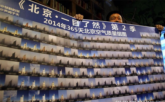 ??????? 鄒毅每天拍攝同一場景一張,組圖365張,讓大家一目了然看到北京的365天的天氣情況,呼吁公眾保護環(huán)境。這是他連續(xù)第二年以同樣方式記錄北京的天氣狀況。市民用手機拍下鄒毅的《北京·一目了然》第2季。