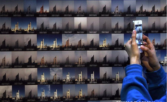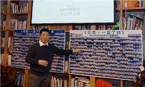 ??????? 這是鄒毅拍攝和拼版的2014年“一目了然”系列照片。鄒毅用2013、2014兩年時間,在同一地點、同一時刻用手機拍攝照片,記錄天氣變化狀況,并將兩年拍攝的700余張照片按年份匯總在一起,希望通過直觀的影像反映北京空氣質量變化,讓更多的人關注霧霾、關注環(huán)境保護。本次分享會是他首次將兩年的拍攝成果一起集中展示。