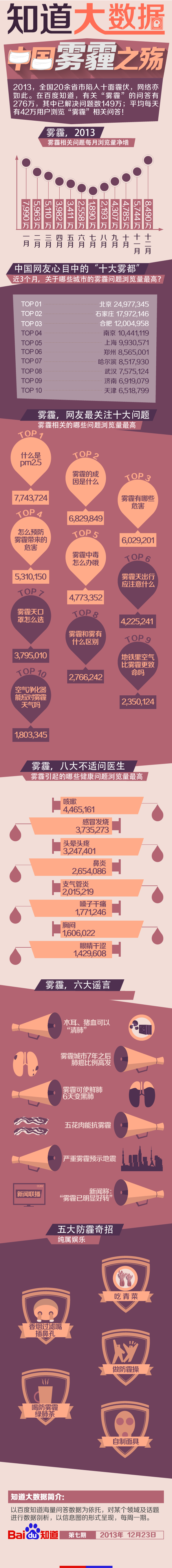 2013,全國20余省市陷入十面霾伏,“霧霾”成為全民話題!在百度知道,有關(guān)“霧霾”的問答有276萬,平均每天有42萬用戶瀏覽“霧霾”相關(guān)問答!知道大數(shù)據(jù),盤點(diǎn)中國網(wǎng)友心目中的“十大霧都”,粉碎霧霾六大流言!對(duì)了,你今天吃青菜了嗎?