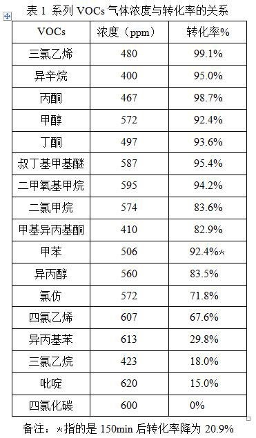 系列VOCs在同樣檢測標(biāo)準(zhǔn)下(即催化劑自身的特性相同,包含同樣的二氧化鈦粒徑規(guī)格、晶相、比表面積等;檢測設(shè)備及檢測標(biāo)準(zhǔn)均相同,包含均應(yīng)用254nm的紫外燈管,一致的氣體流速、相對濕度、氧含量、30min后的穩(wěn)態(tài)檢測標(biāo)準(zhǔn)等)。狀態(tài)見表1: