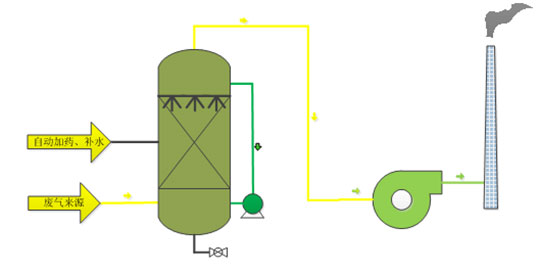 在車間將無組織排放的廢氣首先經(jīng)過收集罩收集后,廢氣經(jīng)過引風(fēng)機作用下,引入含酸(堿)的洗滌塔吸收中和,使含酸(堿)廢氣中和后達標排放。