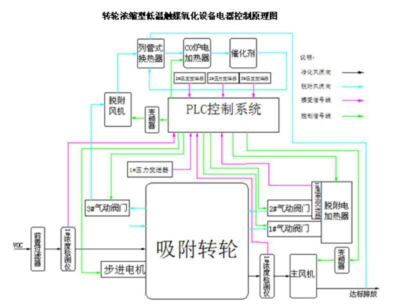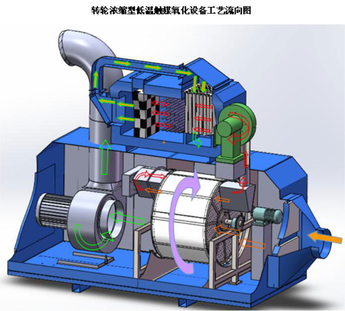 轉輪濃縮型低溫觸媒氧化設備:是采用轉輪式吸附床對有機廢氣進行吸附濃縮,濃縮的有機廢氣在脫附再生區(qū)被脫附后,被再生風機引入催化燃燒凈化裝置,進一步凈化處理。整個裝置分為VOC濃縮區(qū)和濃縮后VOC凈化處理區(qū)兩大模塊。